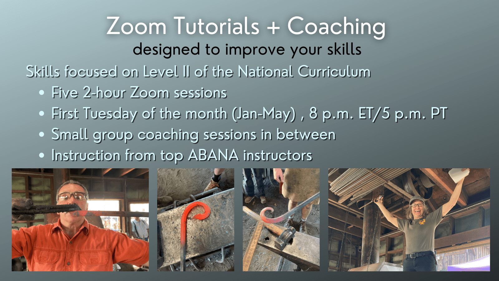 This online Zoom series will focus on the skills and techniques for Level II of the ABANA National Curriculum. Zoom sessions will be held once a month from January through May 2026. All Zoom sessions will be recorded and made available to class participants (typically within a week) for review or to catch up if you are unable to attend a session. Participants will be divided into groups, each with a certified instructor, for small-group coaching between Zoom sessions. Attend the Zoom sessions, take the information back to your shop to practice your forging techniques, and then share with your coaching group to get tips and feedback for next time!