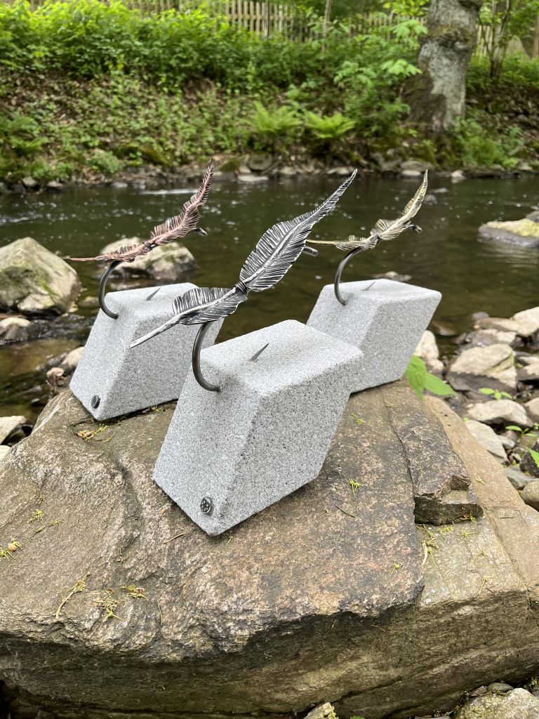 Trophies for the World Fly Fishing Championship. To design these trophies, I chose an abstract form that is the materialization of an allegory that I will try to bring to you in this author’s text. Fly fishing is also my hobby, and I perceive this fishing discipline as incredibly graceful and elegant, which is why I am convinced that these cups should evoke the same. The feather that plays the main role in this work is a minimalistic clue to the essence of this fishing technique, therefore the type of material would change depending on the location. The stone pedestal has this atypical shape for one essential reason, namely that it is supposed to symbolize the flow of the river. The choice of material itself is not accidental; it is a material that is firmly connected to the river. Last but not least, the hook corresponds in proportion to the hook from the Hanák company, specifically the H-230 type.
