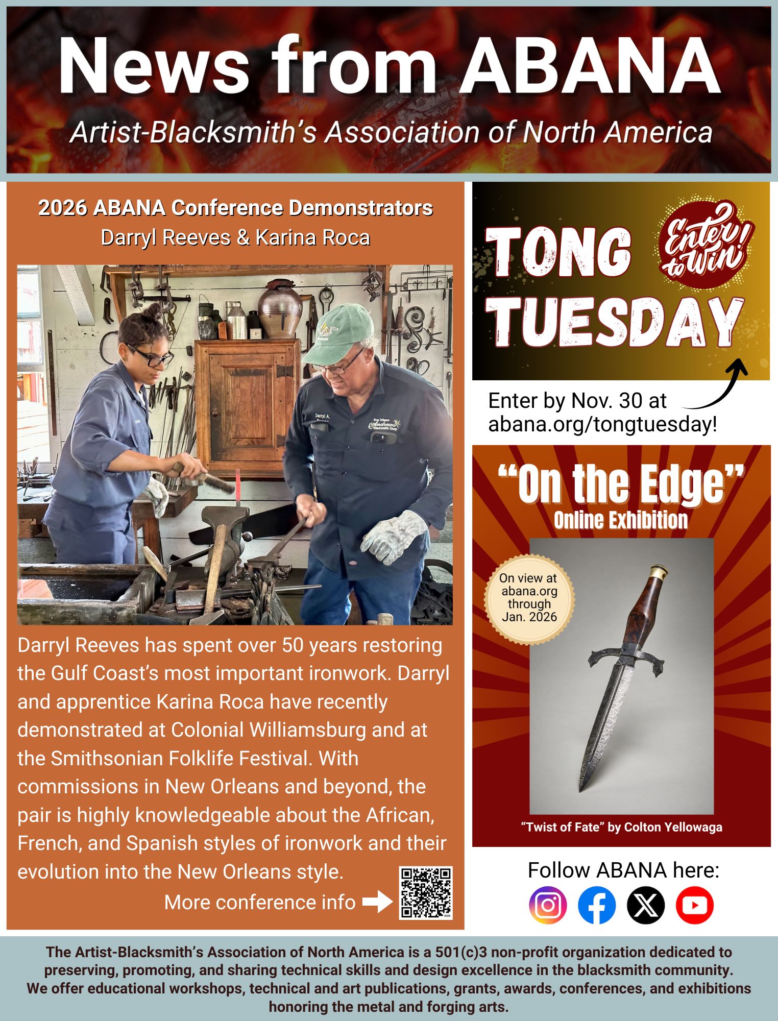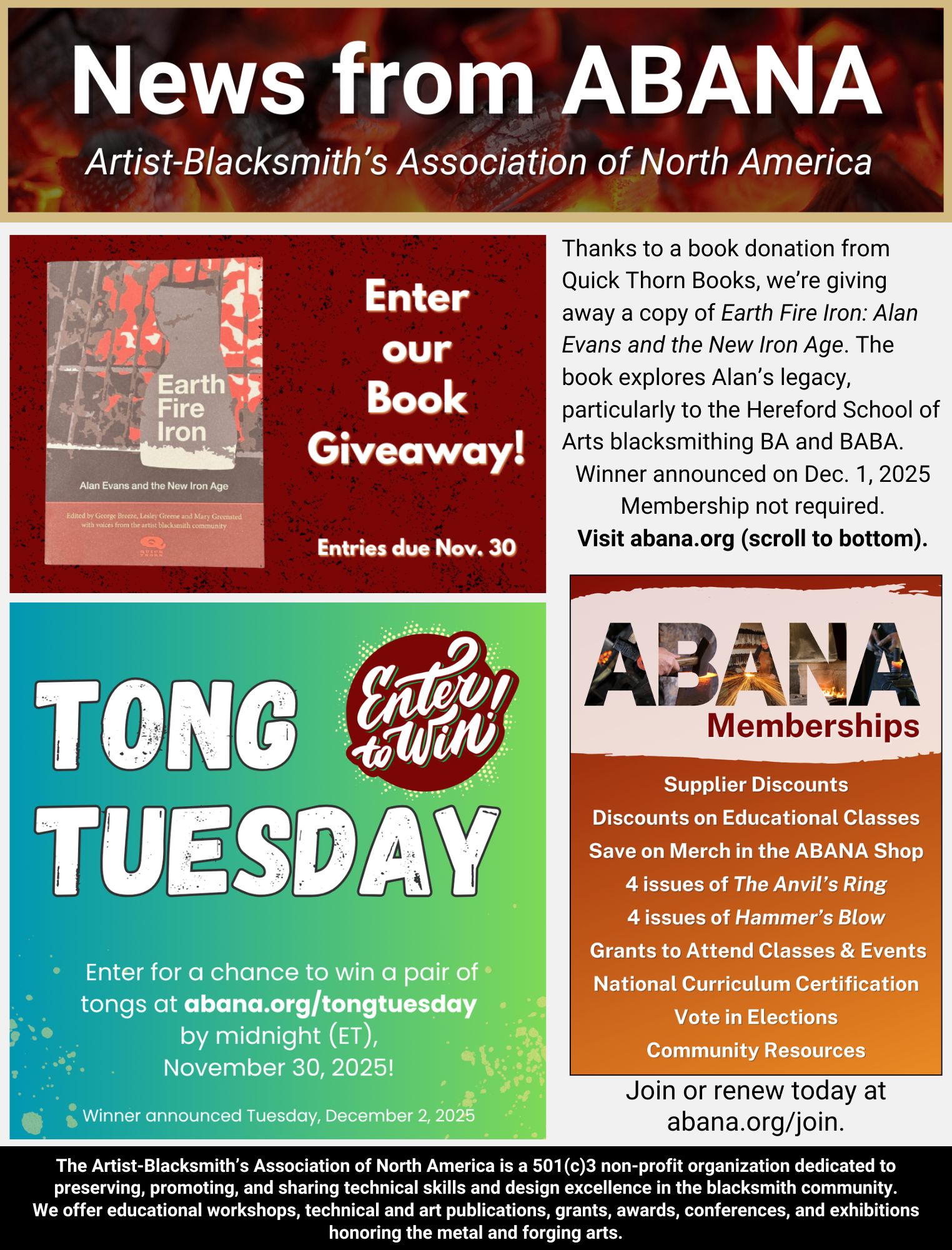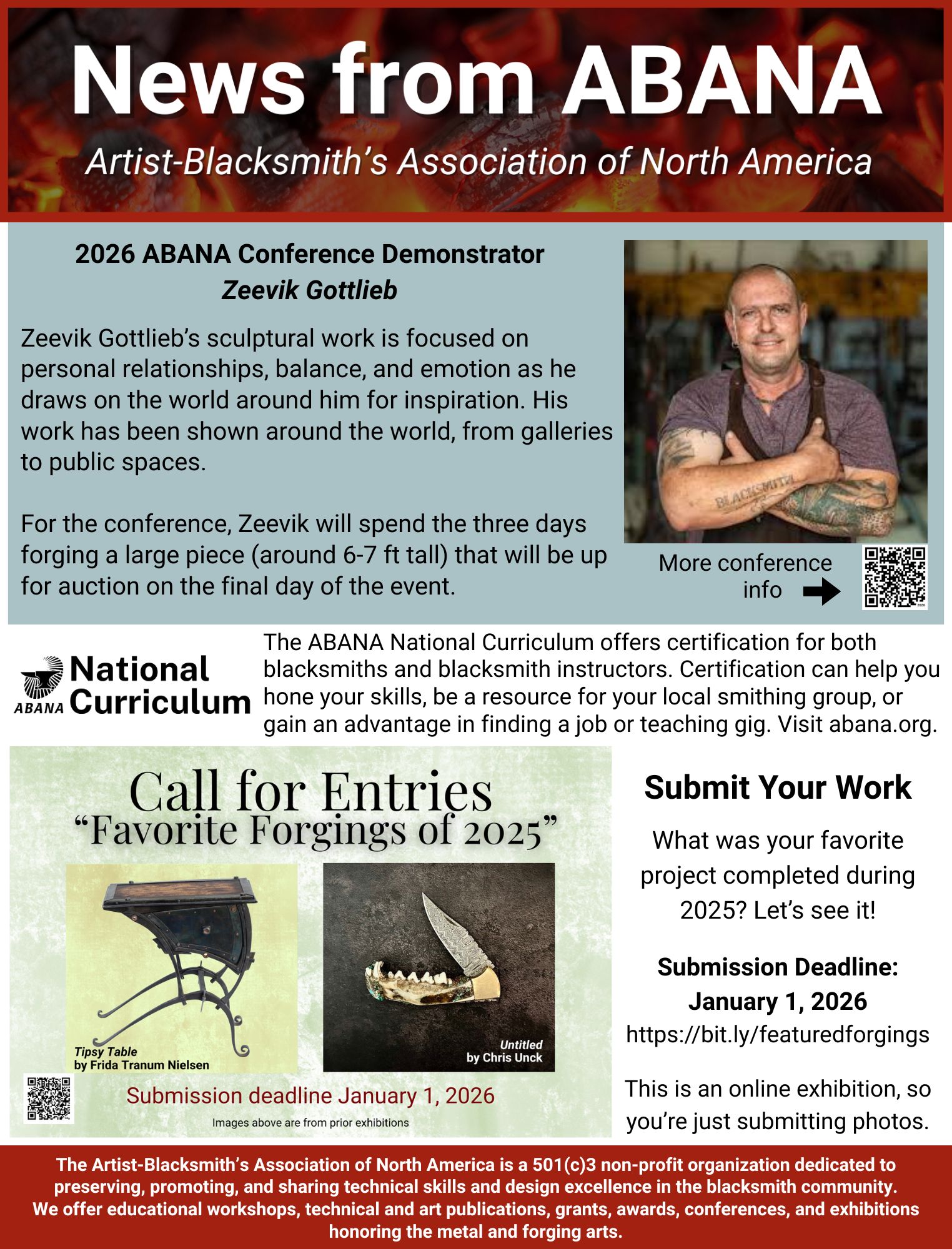 Below are single-page info sheets containing “News from ABANA” that affiliates are welcome to use in their newsletters. Please note the distribution dates! If there are any questions about the information, email your inquiry here.