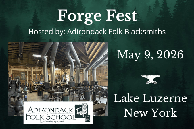 valerie2026-02-12T16:34:47-05:00Adirondack Folk Blacksmiths Forge Fest Folk School Forge Fest May 9, 2026, 9 am - 6 pm at the Adirondack Folk School, 51 Main Street, Lake Luzerne, New York 12846 Activities are open to the public and will include: Blacksmithing Demonstrations by Jonathan Nedbor and others Live Forging Contests with Cash Prizes for all levels of ability Open Forge Time Free Tailgating Iron-In-the-Hat Wood-Fired Pizza Registration and Contest Details Coming Soon at adirondackfolkschool.org. View All Affiliate Events